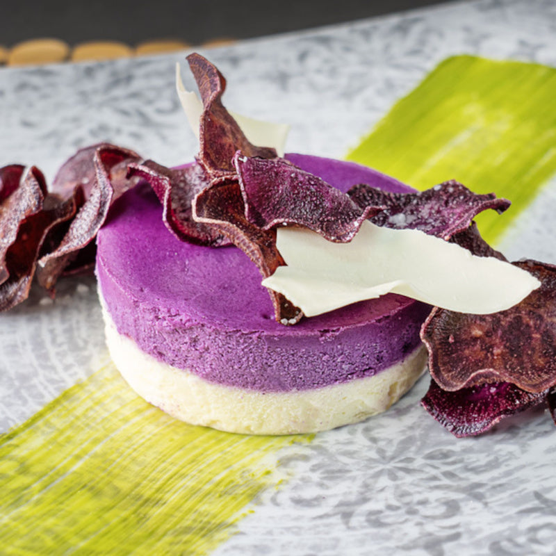 The ube crustless cheesecake features a naturally purple sweet potato popular in Filipino desserts, with a gently sweet, cozy flavor that hints at vanilla and nuttiness, atop a rich, ultra-creamy cheesecake that’s smooth, comforting, and quietly addictive.