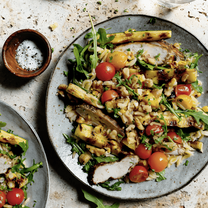 Grilled chicken breast is served on a bed of orzo pasta and arugula. Then we add roasted button mushrooms, grilled zucchini and peppers, beautiful cherry tomatoes and roasted chickpeas. Served with a cup of lemon tahini dressing.
