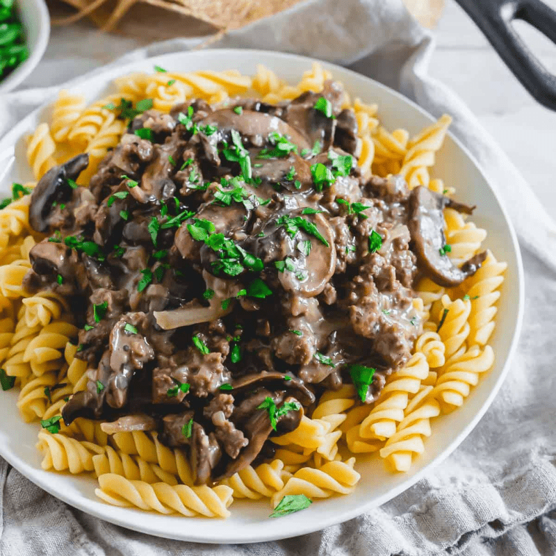 Tender chunks of sirloin sautéed with savory mushrooms in a creamy sauce. Tossed with rotini pasta for the ultimate comfort food.