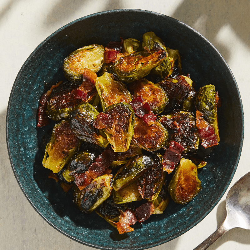 1 pound of fresh brussel sprouts that are tossed with olive oil and seasoning, roasted to perfection, and finished with a drizzle of Maple syrup & bacon pieces. There's not a way to eat this that isn't delicious!